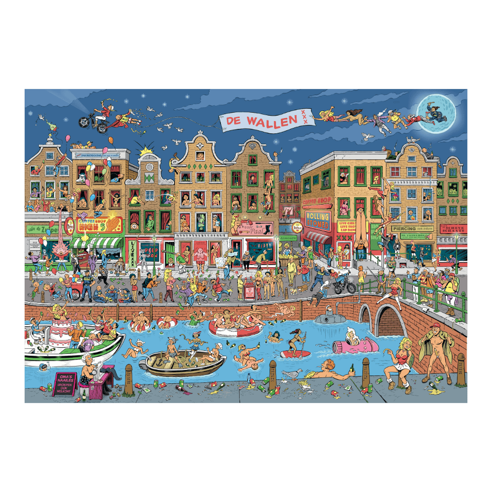 Haal de gezellige sfeer van de Amsterdamse Wallen in huis met deze unieke legpuzzel van 1000 stukjes. Op de puzzel zie je een gedetailleerde illustratie van de Wallen, met grappige situaties, de welbekende straatjes en natuurlijk de karakteristieke rode gloed die dit stukje Amsterdam wereldberoemd maakt.