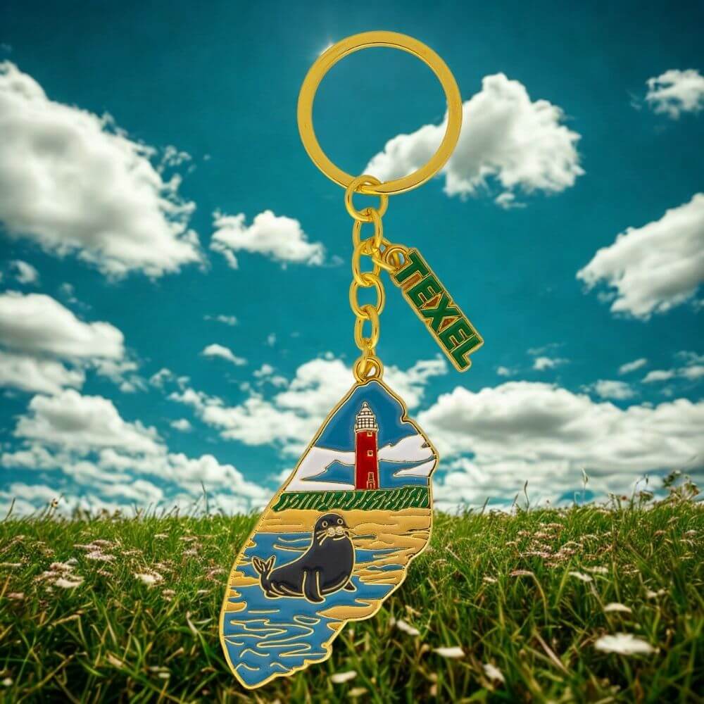 Unieke metalen sleutelhanger in de vorm van het eiland Texel, met daarop een vuurtoren en zeehond afgebeeld. Een compleet Texel-verhaal in één sleutelhanger.