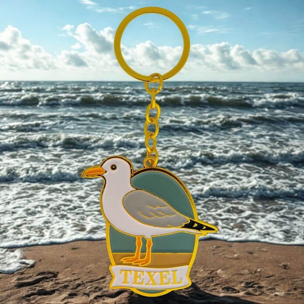 Metalen sleutelhanger met een meeuw en het woord “Texel”. Een speels en herkenbaar ontwerp dat perfect past bij het eilandgevoel. Leuk als souvenir of klein cadeautje.