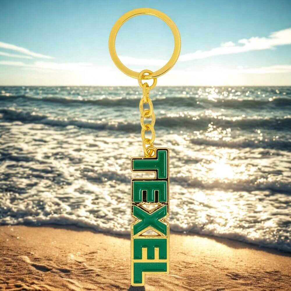 metalen sleutelhanger met het woord “Texel” in een groen-gouden kleurstelling. De hanger is ca. 6 cm lang en ideaal als subtiel souvenir of cadeau voor Texelliefhebbers.k
